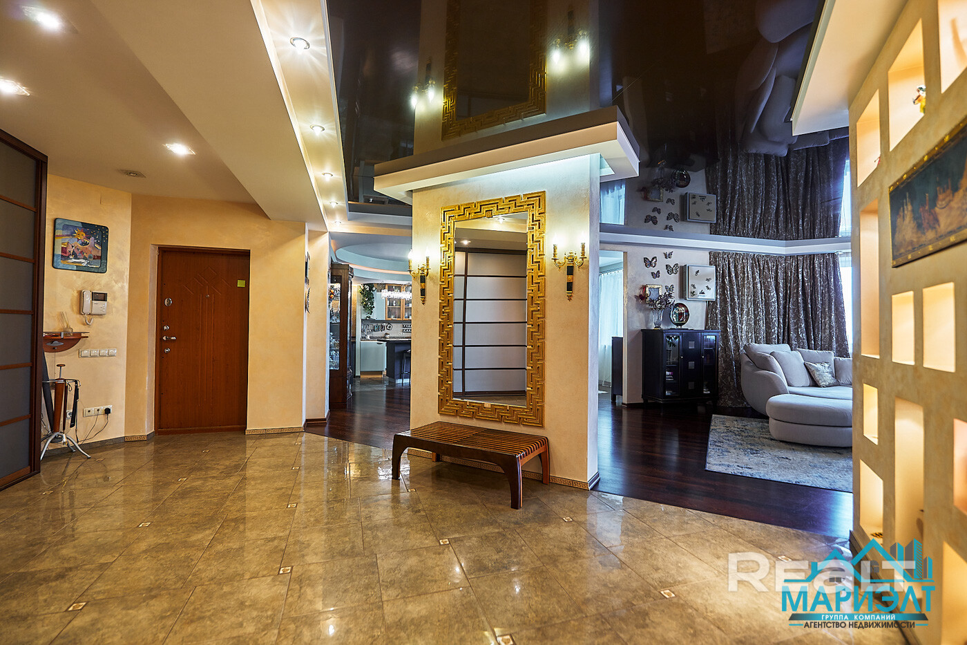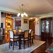 В квартире произведена и узаконена перепланировка- кухня, гостиная и комната отдыха с камином объединены в единое пространство.