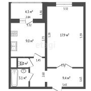 Общая площадь квартиры по СНБ — 43,3 кв.м, кухня — 9 кв.м. Современная планировка обеспечивает удобное и функциональное использование пространства. Санузел раздельный.