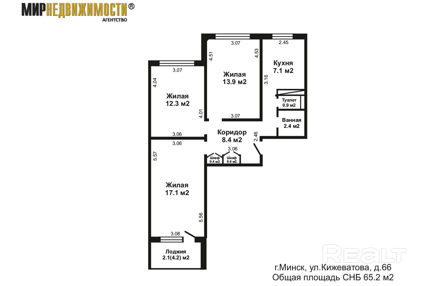 Общая площадь СНБ 65,2 м2, жилая площадь 43.3 м2, кухня 7.1 м2.