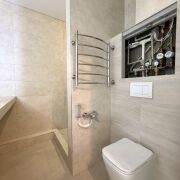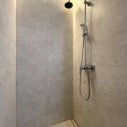 • санузел облицован современной плиткой, оборудована душевая зона
