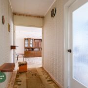 На полу доска и линолеум, стены обои, потолки побелка, в санузлах уложена плитка.