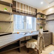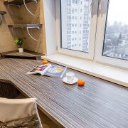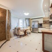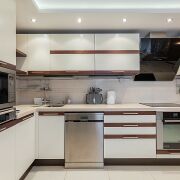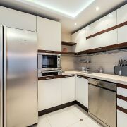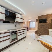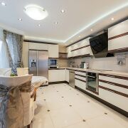 Кухонная зоной оборудована варочной панелью, посудомоечной машиной, свч печью, духовым шкафом, встроенным холодильником.