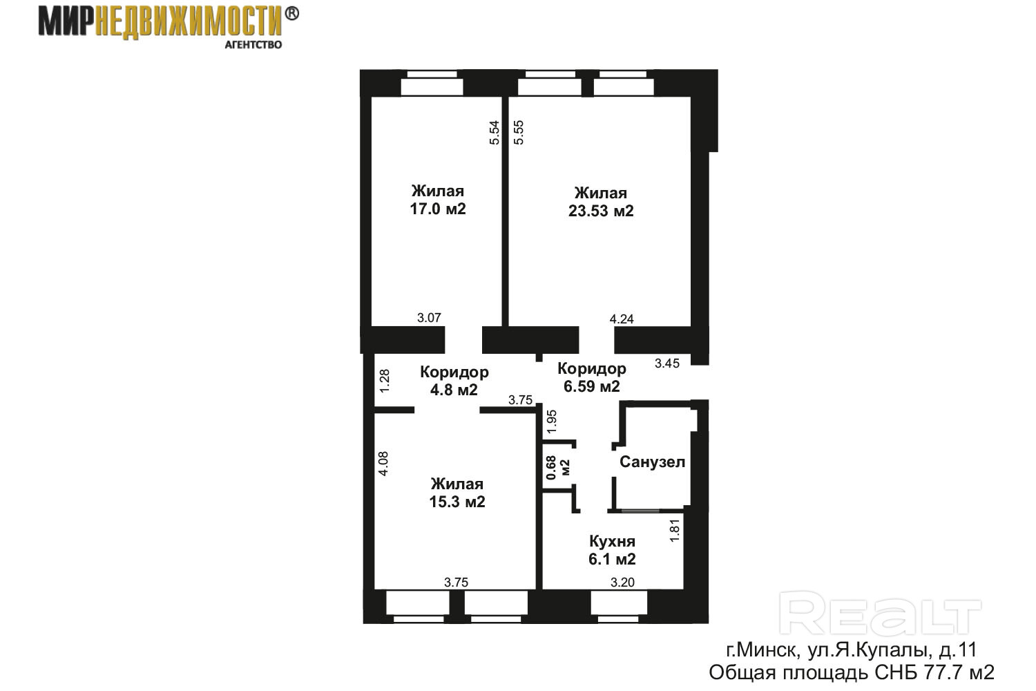 Площадь 77,7 кв.м., жилая площадь 55,83 кв.м., кухня 6,1 кв.м. Совмещенный санузел. Высокие потолки – 3,12 м.
