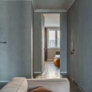 При входе и в кухонной зоне уложена итальянская плитка керамогранит, в спальне и гостиной — паркетная доска Coswick. Межкомнатные двери скрытого монтажа нестандартного размера до потолка выполнены на заказ, что придаёт интерьеру элегантный вид. Кухня с встроенной мебелью из МДФ, потолки из гипсокартона окрашены, а стол и подоконники изготовлены из плиты GetaLit Compact HPL, которая устойчива к дезинфекции, перепадам температур и механическим воздействиям, обеспечивая долговечность в условиях высокой проходимости. Также установлен бойлер на случай отключения горячей воды.