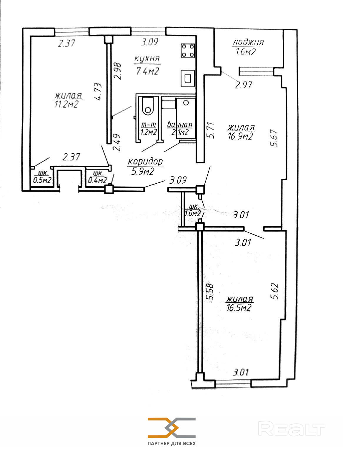 В квартире комнаты 16.9, 16.5 и 11.2 м.кв. расположены на разные стороны, окна выходят в основном во двор с видом на зелёную зону и детский садик. Окна стеклопакеты, в санузлах кафель и плитка, в кухне - кухонная мебель и встроенная кухня.