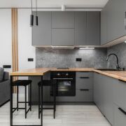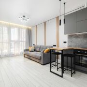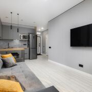 -Современная кухня полностью оснащена: стильный кухонный гарнитур с встроенной техникой, холодильник, духовка, микроволновка, вытяжка — всё готово к использованию.