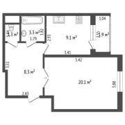 Квартира расположена на 3 этаже 4-ех этажного кирпичного дома 2006 года постройки. Одна просторная комната 20.1 кв.м. и полностью оборудованная кухня 9.1 кв.м. с выходом на застекленную лоджию, встроенные шкафы. Санузел раздельный. Есть подвальное помещение. Большая парковка во дворе. Окна выходят на одну сторону, солнечная сторона до 12 часов дня, после чего солнце уходит за дом и в жаркие дни в квартире прохладнее, чем в других квартирах на площадке.