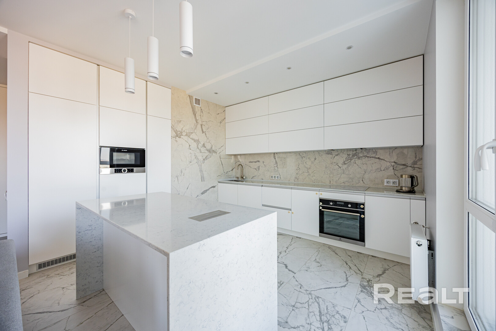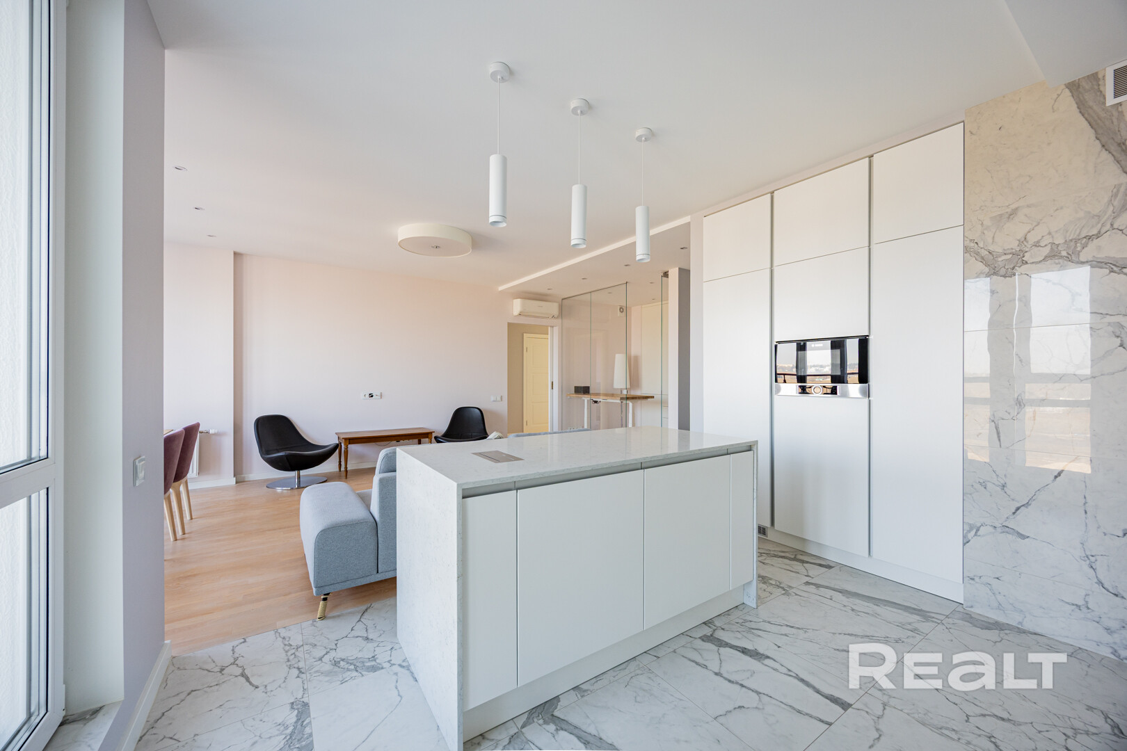 — Кухня-гостиная с островом: встроенная морозилка + розетка в столешнице (открывается кнопкой).