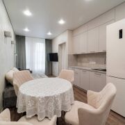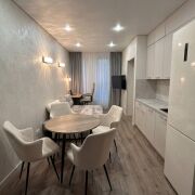 Выполнен качественный ремонт: стены отделаны декоративной штукатуркой, на полу- кварцвинил, в ванной комнате — пол с подогревом. Установлены энергосберегающие стеклопакеты в алюминиевом профиле с высокой звукоизоляцией, кондиционер, система фильтрации воды. Кухонная фурнитура — немецкого бренда. Вся сантехника — Германия и Польша, техника с расширенной гарантией до 5 лет.Дизайнер продумал грамотное зонирование — в квартире есть отдельная жилая комната.