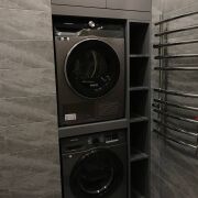 Квартира оборудована всей необходимой техникой: индукционная варочная панель Samsung, духовой шкаф LG, встроенная микроволновая печь Hansa, посудомоечная машина, холодильник LG, стиральная и сушильная машины Samsung;