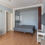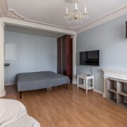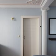 Гостиная украшена стильной гипсовой лепниной. Стены отделаны обоями под покраску с возможностью выбора цвета краски.