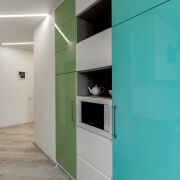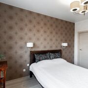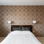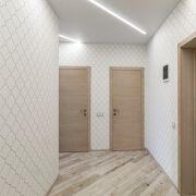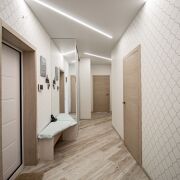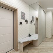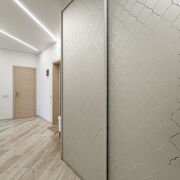 · В квартире установлен вместительный шкаф-купе с изящной фрезеровкой на фасадах, повторяющей рисунок обоев.