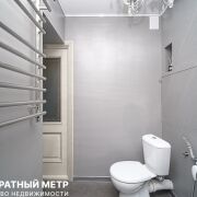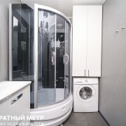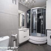 Совмещенная ванная комната – единое пространство 4.8 кв.м. Дополнено гигиеническим душем и вместительным шкафом для хранения.