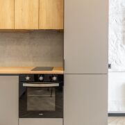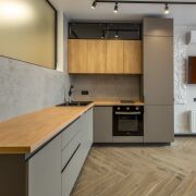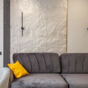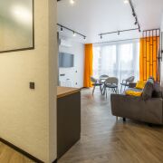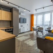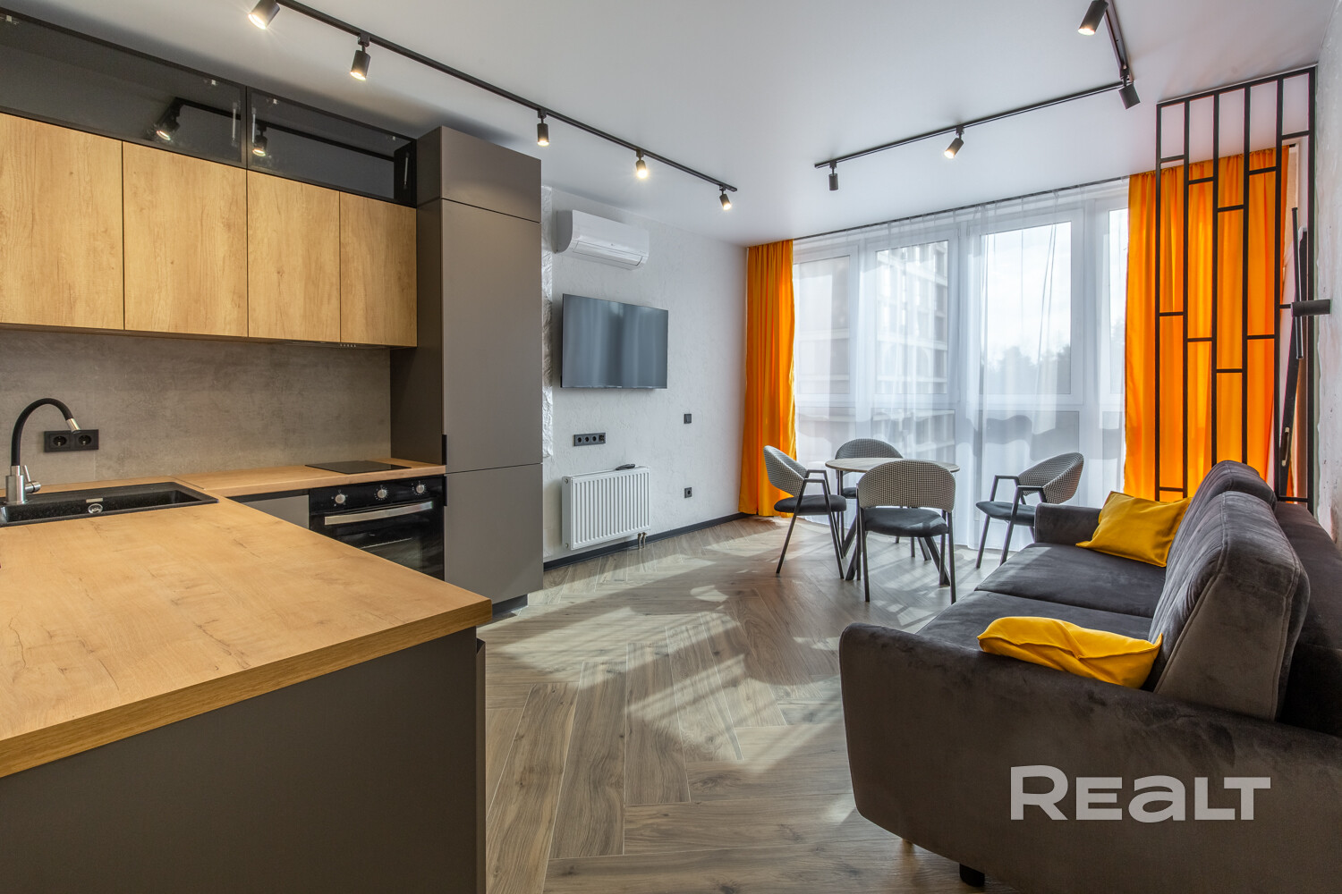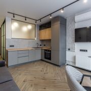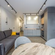 - Квартира выполнена в современном дизайнерском стиле - с выразительной планировкой и четким разделением зон. Пространство включает кухню-гостиную и спальню. Зона спальни отделена стильной перегородкой.