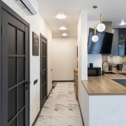 Собственник очень много вниманию уделил освещению – установлено много точек света в каждой комнате, в т.ч. дополнительно сделана качественная подсветка карнизов.