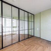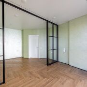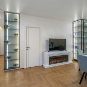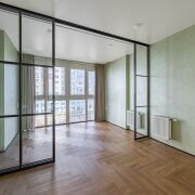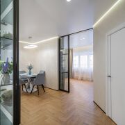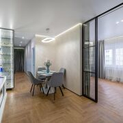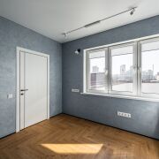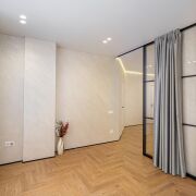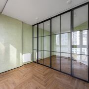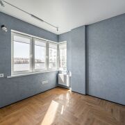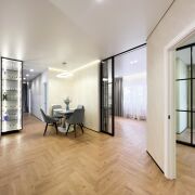 - Общая площадь квартиры по СНБ - 186,7 кв.м. Жилая площадь представляет собой 4 раздельные комнаты (по 18,6 м, 10 м2, 10 м2 и жилую комнату с кухонным оборудованием 43,7 м2, где для разделения комнаты установлены скрытые межкомнатные раздвижные перегородки со стеклянным алюминиевым профилем.