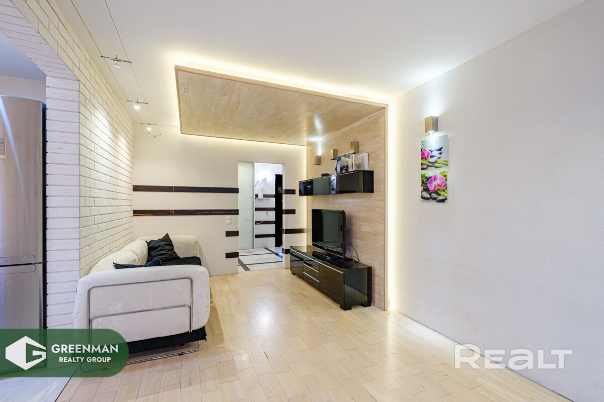 Здесь выполнен аккуратный современный ремонт в светлых тонах, благодаря чему квартира выглядит свежей, ухоженной и визуально еще более просторной. Просторная жилая комната 17,7 м2 оформлена стильно и со вкусом: декоративный кирпич, продуманное зонирование и освещение создают атмосферу уюта и делают это пространство идеальным для отдыха, встреч с близкими и семейных вечеров.