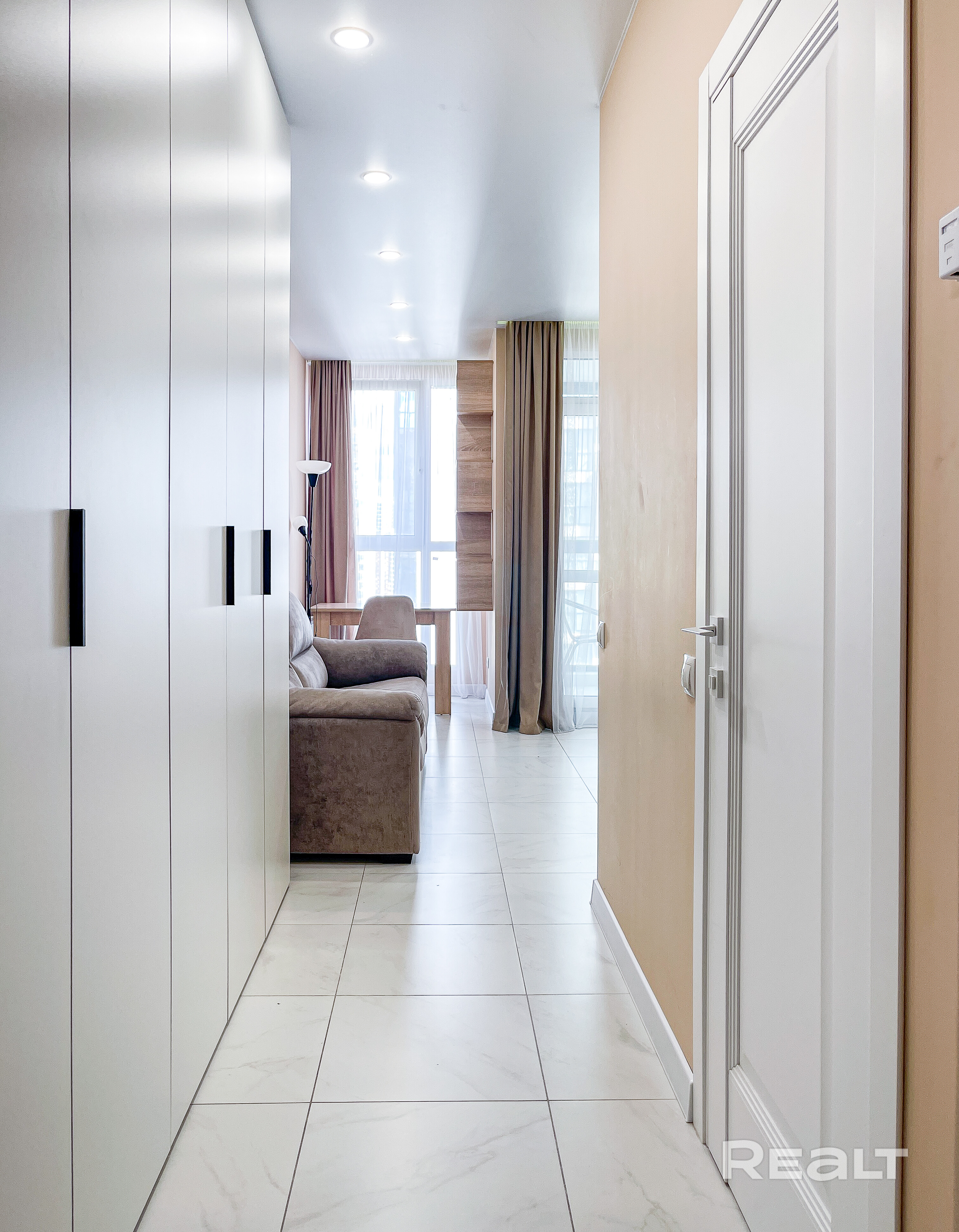 Выполнен современный ремонт с использованием качественных материалов. Напольное покрытие - плитка. Натяжные потолки. Светлая встроенная кухня с техникой. Современный санузел. Сделано грамотное зонирование и продуманное освещение.