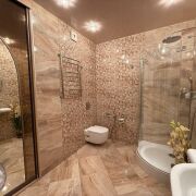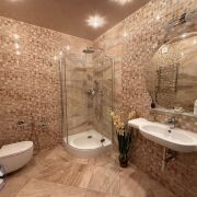 - Полы: ламинат 33 класса и итальянская плитка с электрическим подогревом в зоне санузлов и кухни