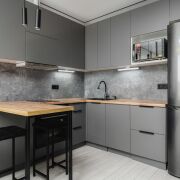 -Современная кухня полностью оснащена: стильный кухонный гарнитур с встроенной техникой, холодильник, духовка, микроволновка, вытяжка — всё готово к использованию.