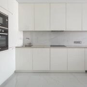 Качественная каменная столешница, мебель размещена под потолок, что увеличивает возможности хранения.