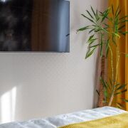 На стене размещен телевизор, напротив ТВ зоны комфортабельный диван, чтобы можно было с комфортом отдохнуть после рабочего дня.
