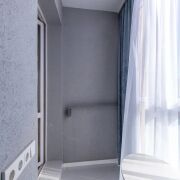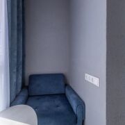 Лоджия: пространство, которое может стать рабочим кабинетом или зоной для отдыха. Окна в пол, размещен небольшой диван и журнальный столик.