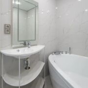 Сан.узел: совмещенный, в современной плитке, импортная сантехника. Установлена инсталляция, ванная, умывальник, зеркало, места для хранения.