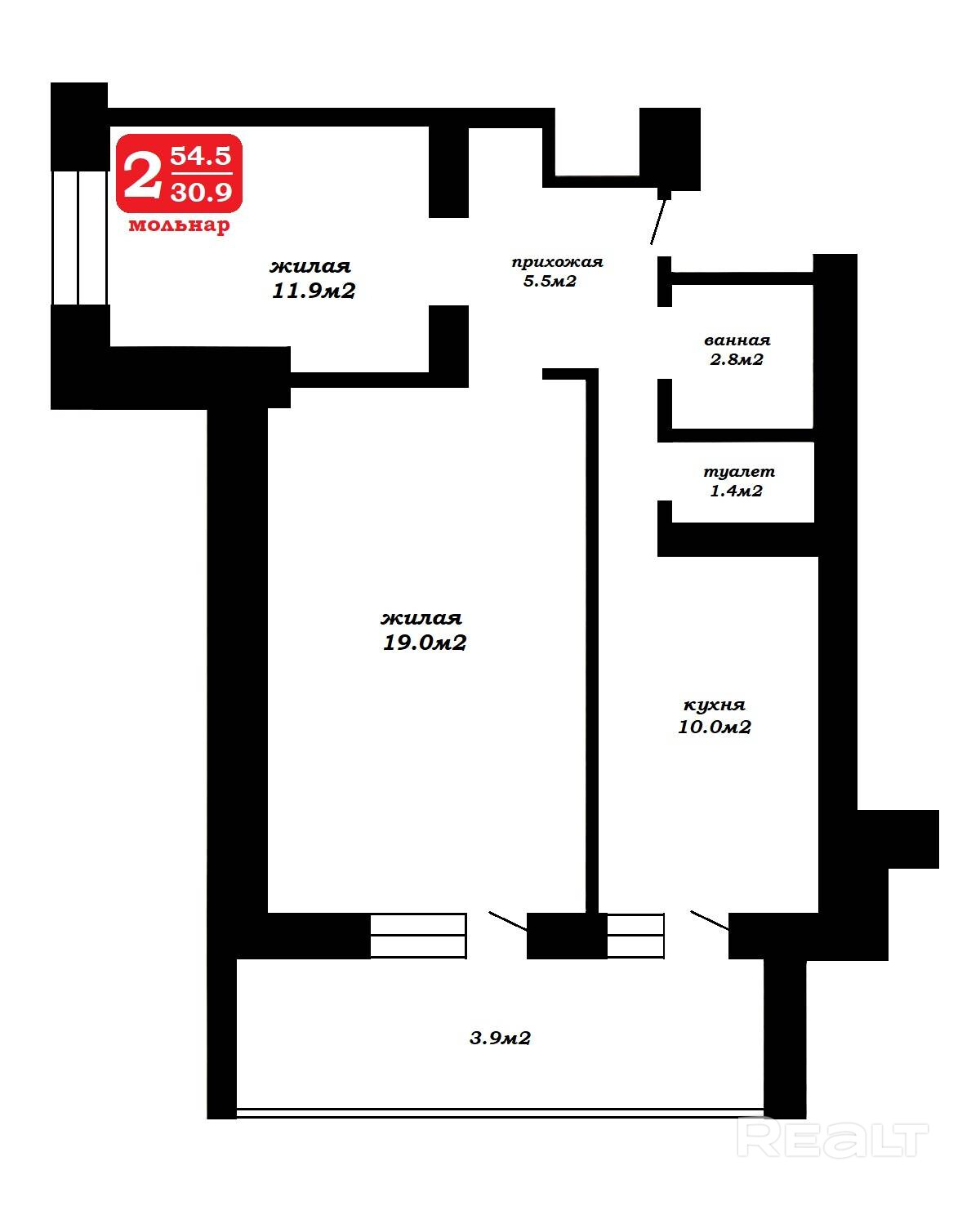 Общая площадь квартиры по СНБ 54,5 м2, жилая 30,9 м2, кухня 10,0 м2.