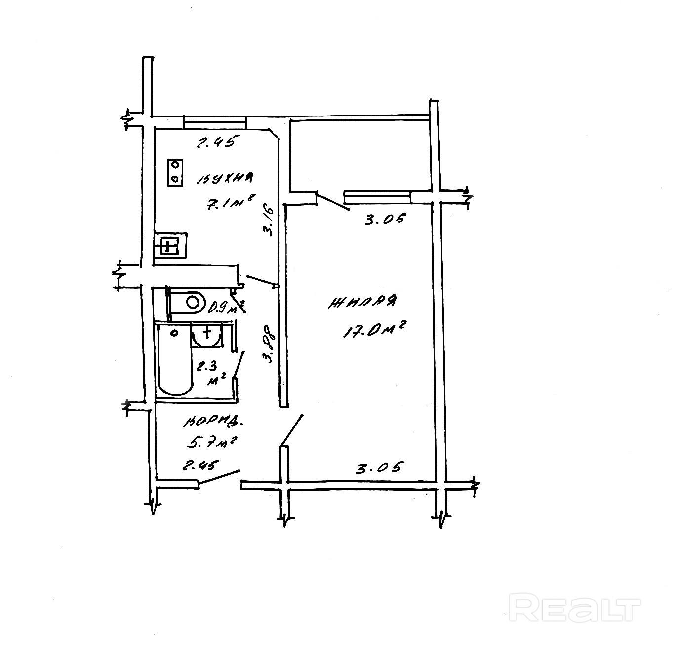 Площадь по СНБ 35,0м2, общая площадь 33,0м2 , площадь комнаты 17,0 м2, кухня - 7,1м2.