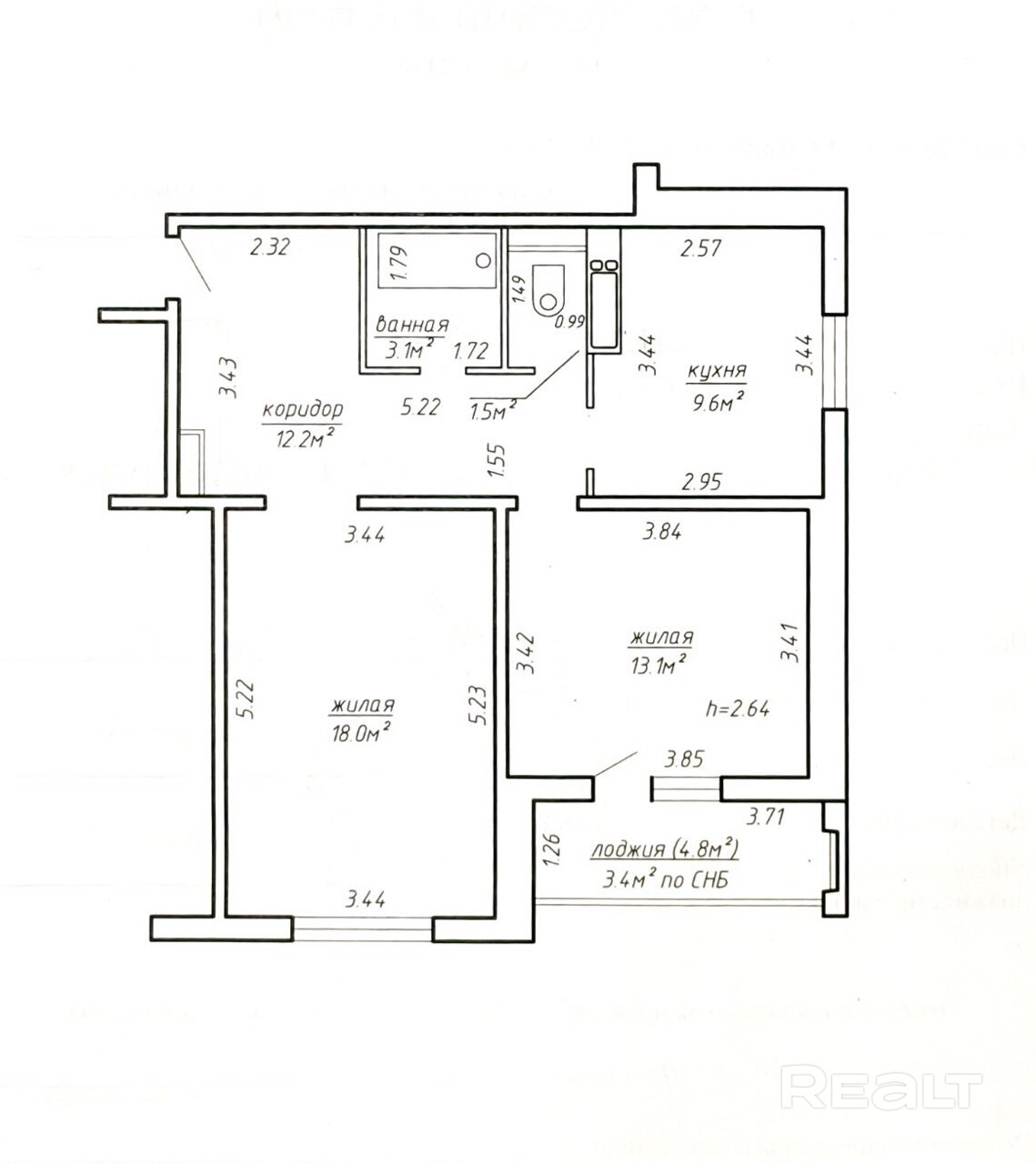 Общая площадь квартиры по СНБ – 60.9 кв.м., общая площадь – 57.5 кв.м., жилая площадь – 31.1 кв.м., кухня – 9.6 кв.м., высота потолков – 2.64 м.