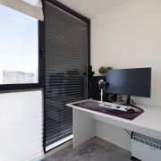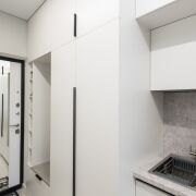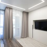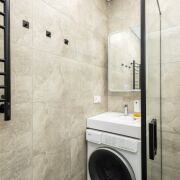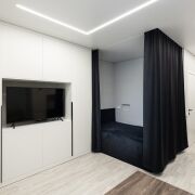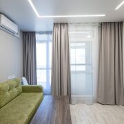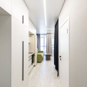 Планировка студии с очень удачной планировкой и широкая, что позволило в квартире сделать зону для отдыха с гостевым диваном и отдельную спальную зону. Эргономика в этой квартире на высоте: кухня со всей техникой, продуманы места для хранения и их достаточно! Изюминка квартиры еще и в том, что на застекленной вместительной лоджии разместился рабочий кабинет.