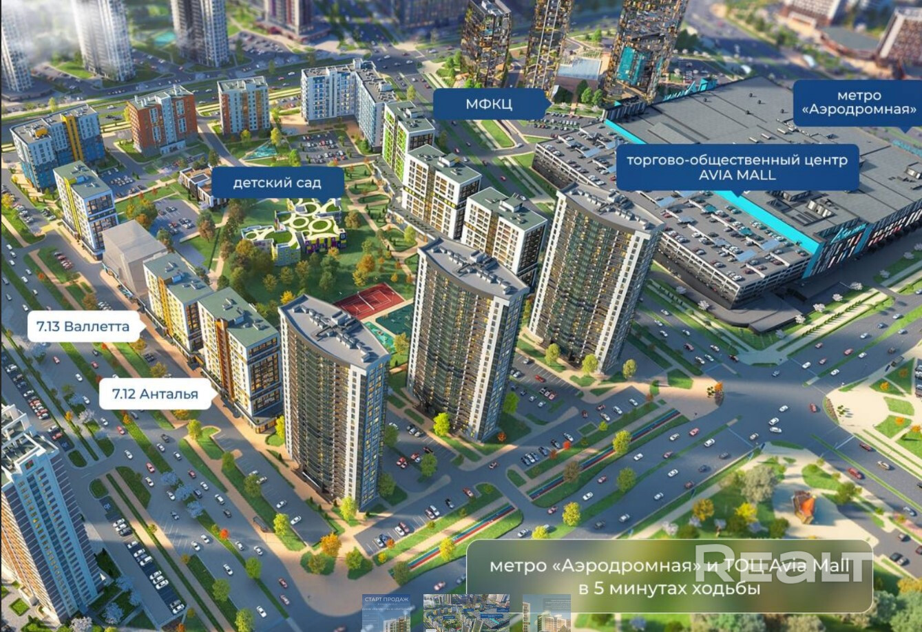 Зеленая парковая зона, международный финансовый центр и крупнейший торговый центр Авиа Молл в центре комплекса в пешей доступности будет вся инфраструктура Minsk World – взрослая и детская поликлиника, медицинский центр, кафе и магазины, парковки, спортивные залы и фитнес-центры.