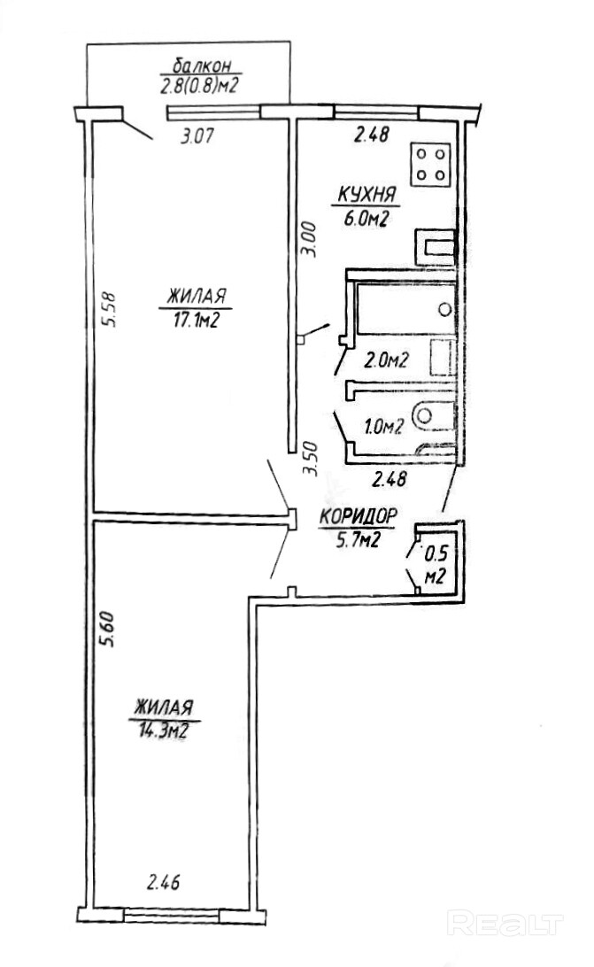 Площадь комнат: 17,1 кв.м. и 14,3 кв.м.