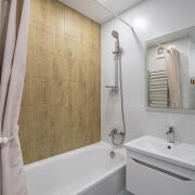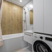 Санузел: Совмещенный, выполнен в светлых тонах с акцентной плиткой под дерево. Установлена качественная европейская сантехника и стиральная машина Samsung.