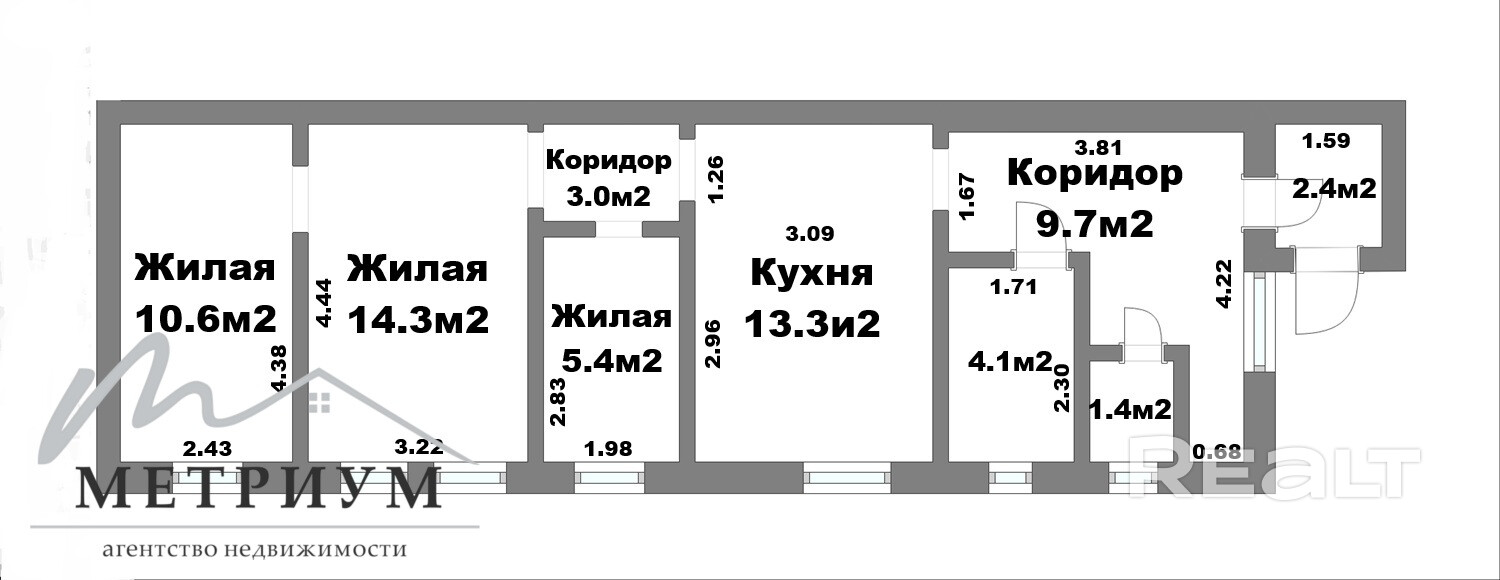 Три комнаты: 10,6м2, 14,3м2, 5,4м2 и кухня 13,3м2.