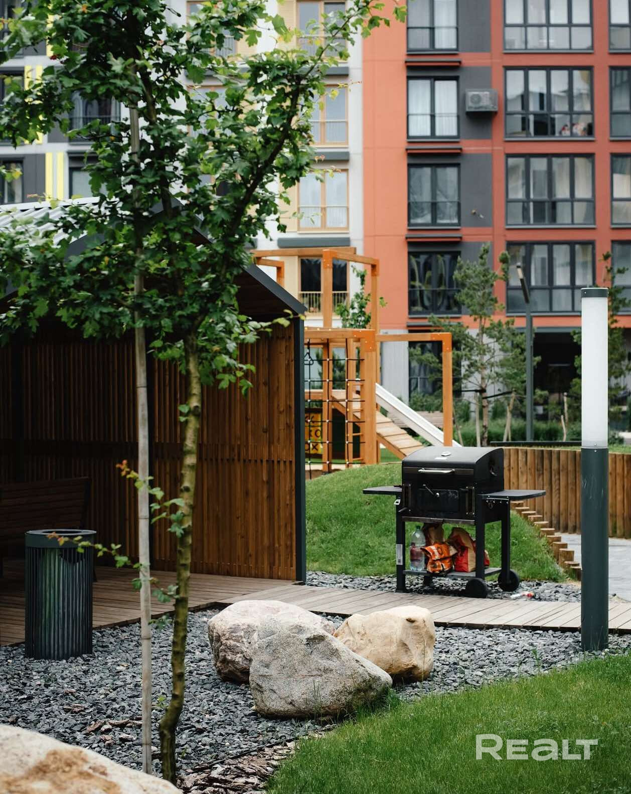- Центральная площадь с большим навесом для встреч и детской площадки
