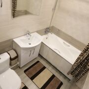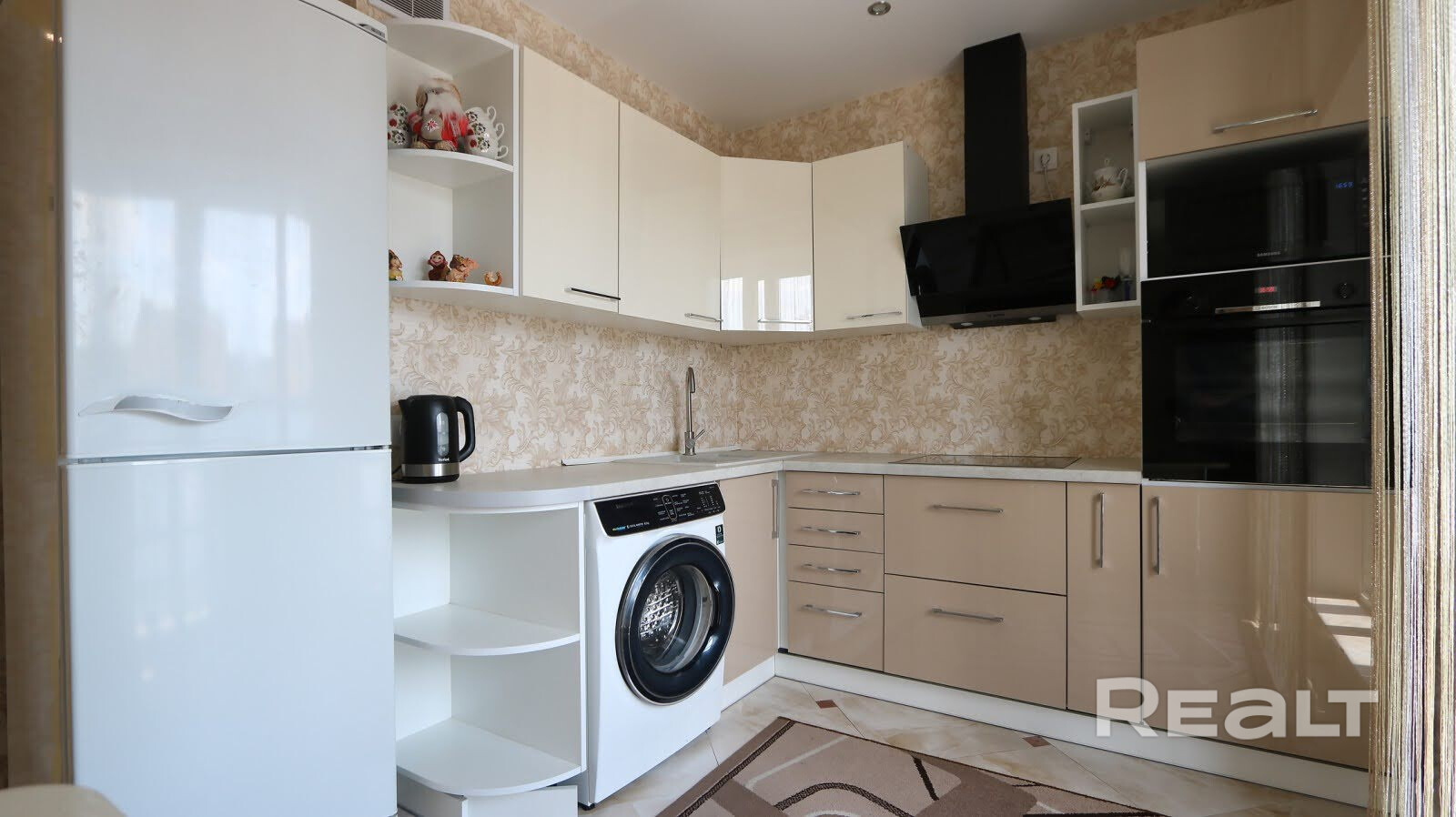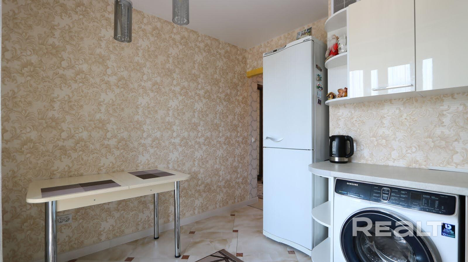Квартира продается с мебелью и техникой. Встроенная кухня с качественной импортной техникой: варочная панель, духовой шкаф, вытяжка, печь СВЧ, холодильник, стиральная машина.