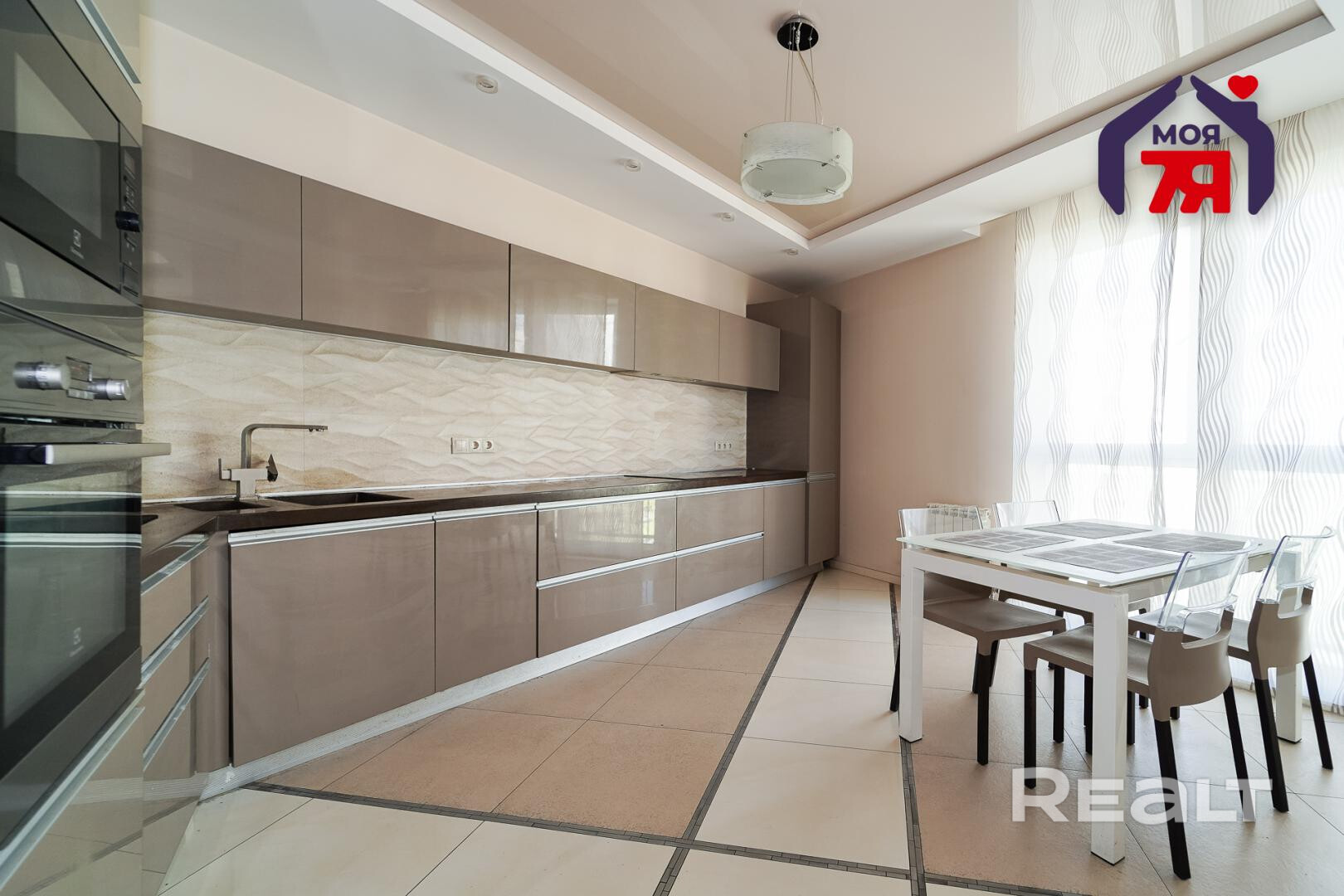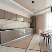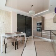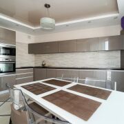 Кухня полностью укомплектована  встроенной техникой: духовой шкаф, микроволновая печь, варочная панель и посудомоечная машина.