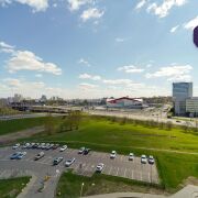 Панорамные окна открывают захватывающий вид на город.