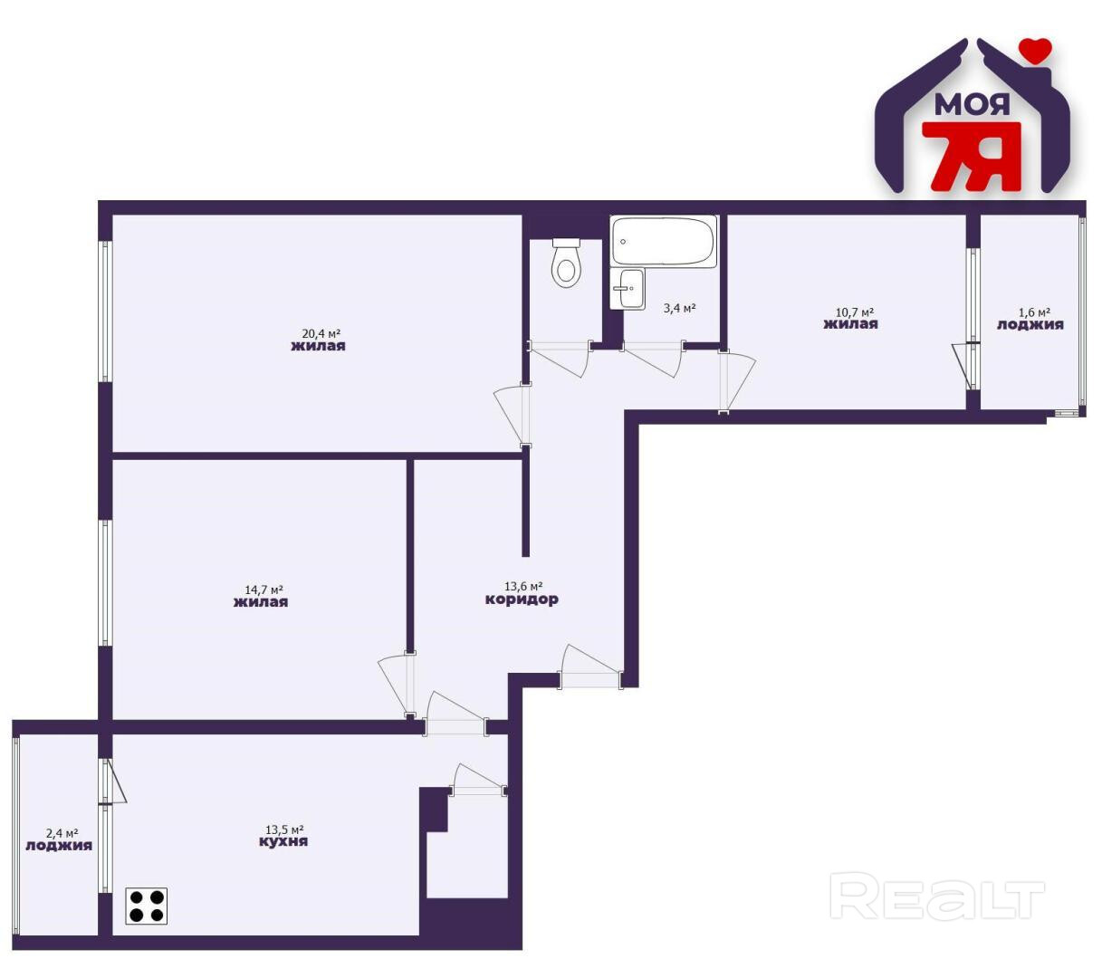 - Общая площадь квартиры – 79,6 кв.м. Просторная гостиная 20.4 кв.м. и две жилые комнаты - 10.7 кв.м. и 14.7 кв.м. Все комнаты изолированные.