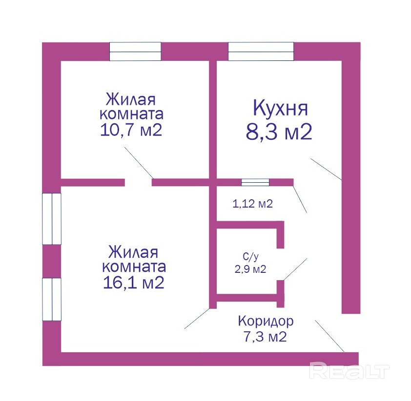 Общая площадь: 46 м2, жилая 27 м2, кухня 8.3 м2.