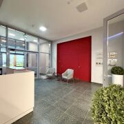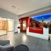— стильный холл с зоной ресепшн для консьержа
