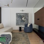 В зоне гостиной установлен большой удобный диван и тумба под ТВ.