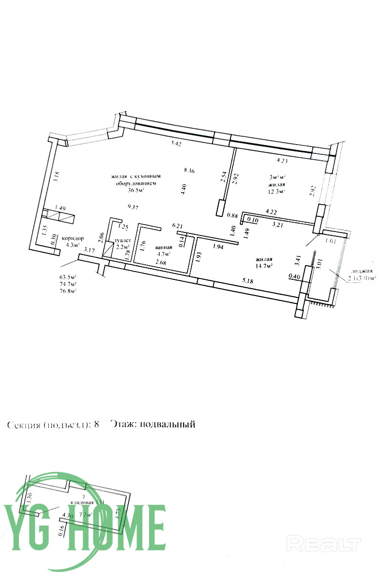 Общая площадь квартиры по СНБ – 76.8 кв.м., общая площадь – 74.7 кв.м., жилая площадь – 63.5 кв.м., высота потолков - 2.74 м. Окошки выходит на две стороны, в том числе и на р.Свислочь!
