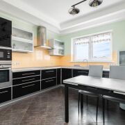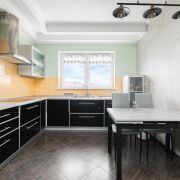 -Кухонный гарнитур включает в себя всю необходимую технику от бренда Electrolux: варочная панель, духовой шкаф, микроволновая печь, встроенный холодильник, морозильник, посудомоечная машина и вытяжка. Фартук выполнен из современной плитки, которая легко моется и придаёт кухне стильный вид.