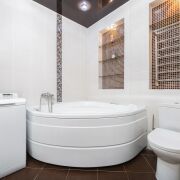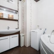 -Особенно стоит отметить, что в квартире 2 санузла. В одном - душевой уголок и умывальник. Во втором - большая ванна-джакузи для приятного релакса после насыщенного дня. Везде установлена качественная сантехника и уложена стильная плитка. Установлена стиральная машина Electrolux с вертикальной загрузкой.