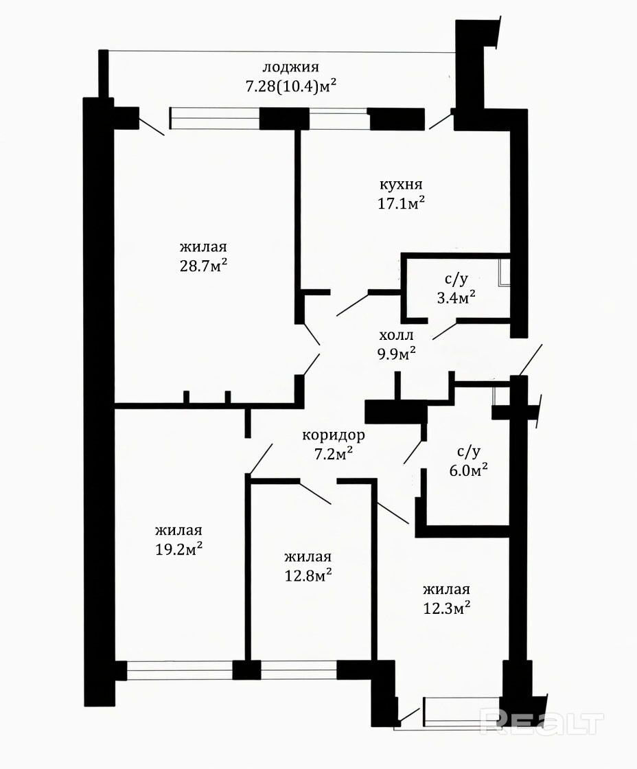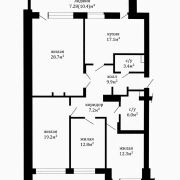 Функциональное зонирование: Планировка включает огромную гостиную (28.7 м2) и три изолированные жилые комнаты, что идеально для большой семьи.