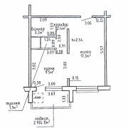 Квартира состоит из жилой комнаты (17.3 кв.м.), кухни (9.5 кв.м.), коридора (2.4 кв.м.), санузла (1.1 кв.м.), ванной (3.2 кв.м.) и лоджии (2.9 кв.м.).