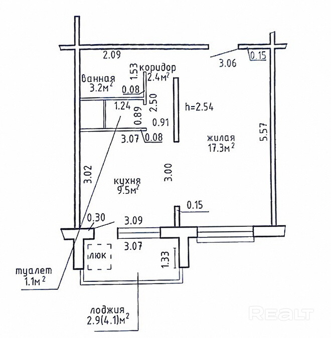 Высота помещения 2.54 м.
